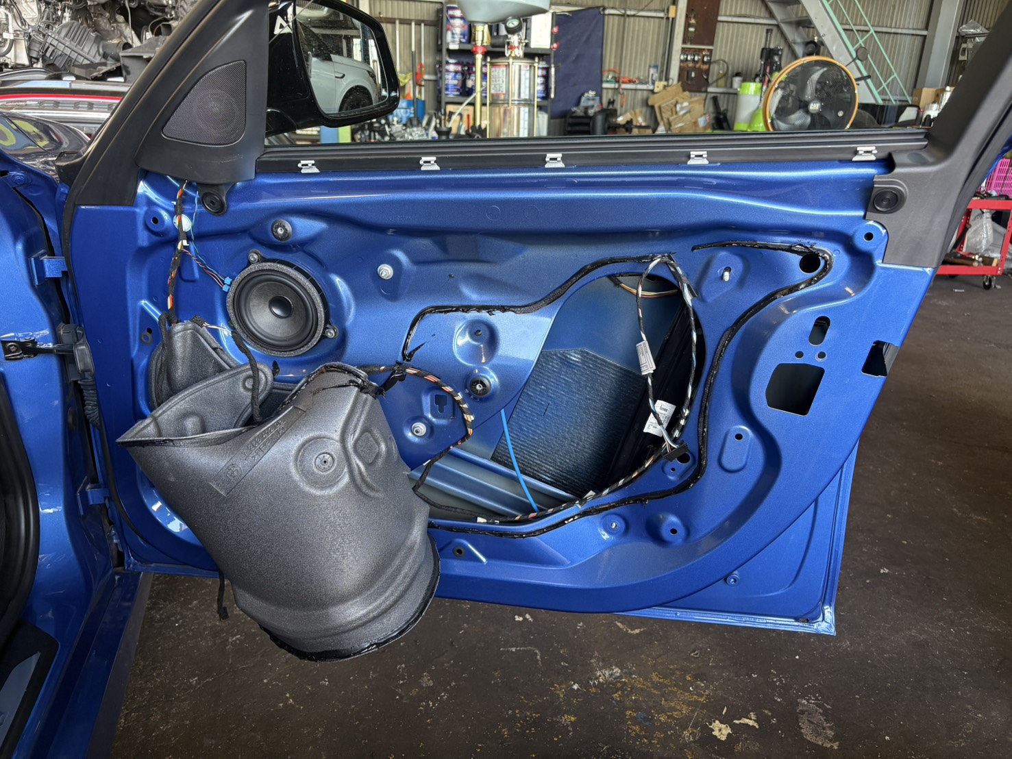 作業では内装パネルを丁寧に取り外し、作業スペースを確保。故障しているドアロックアクチュエータを慎重に取り外し、新品アクチュエータに交換。配線接続や固定部の確認も行いながら、確実に取り付けました。