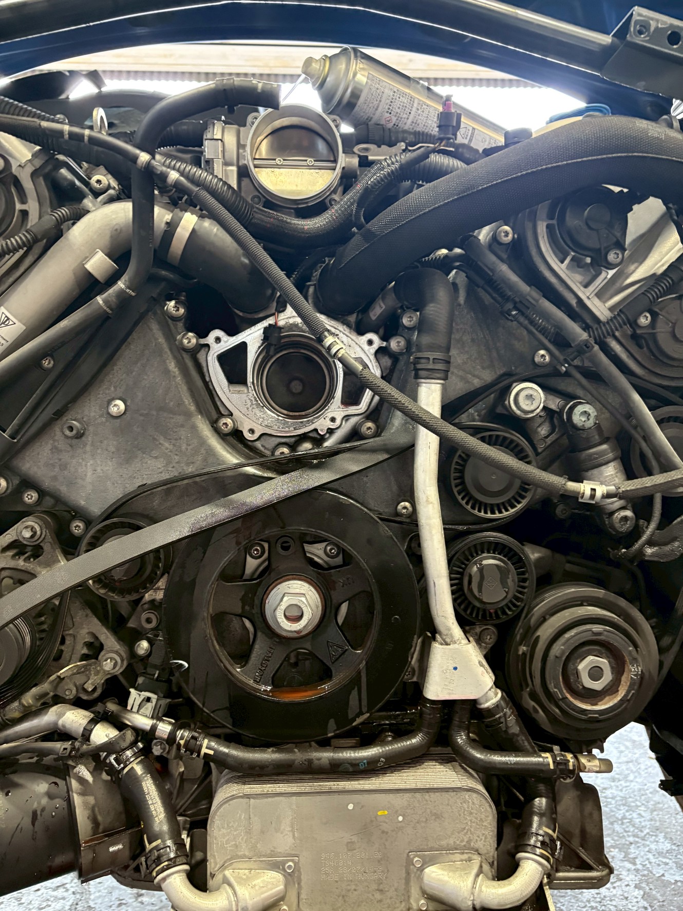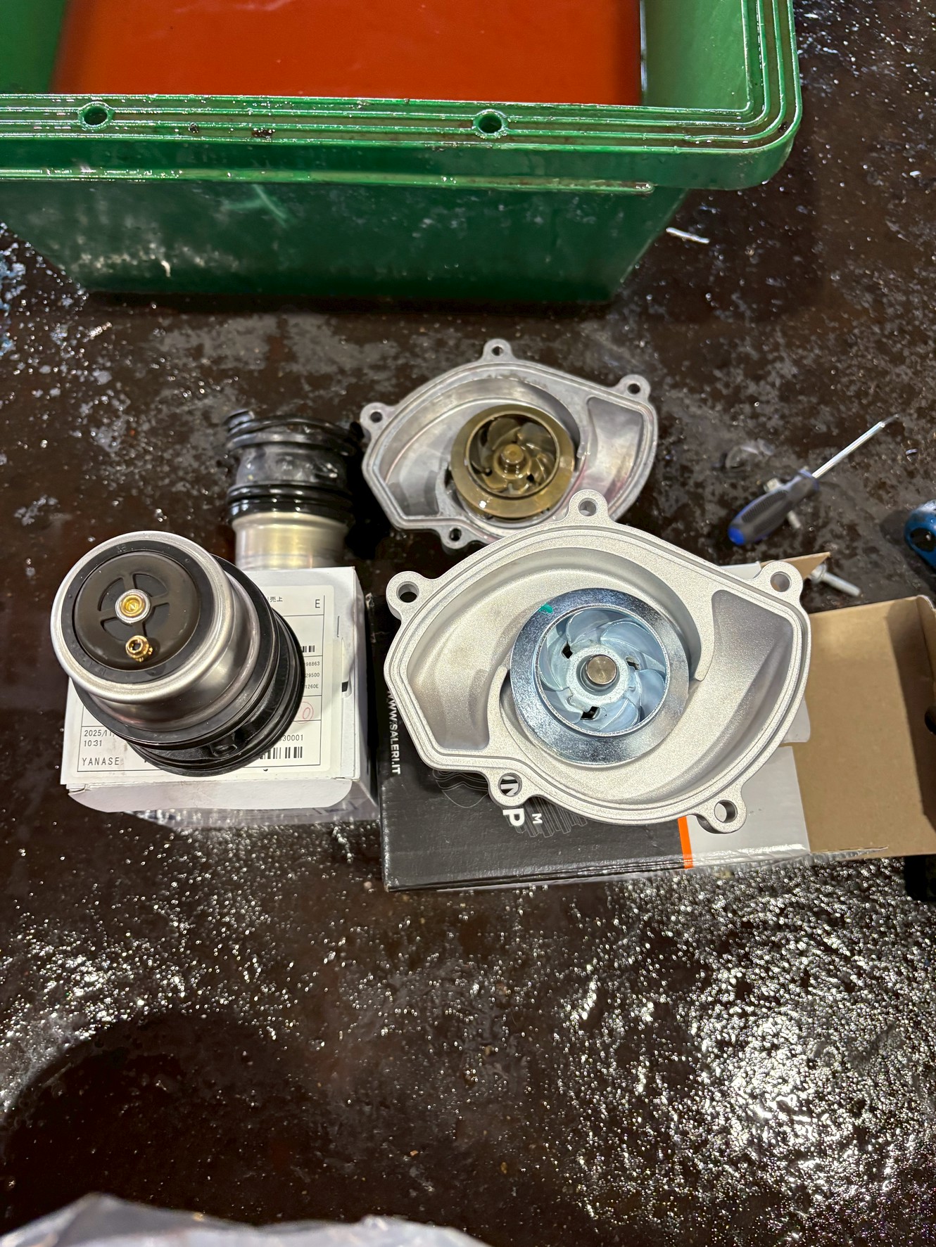 同時にウォーターポンプも交換を実施。冷却水の循環不良や将来的な水漏れリスクを防ぐため、関連部品を含めてリフレッシュしました。