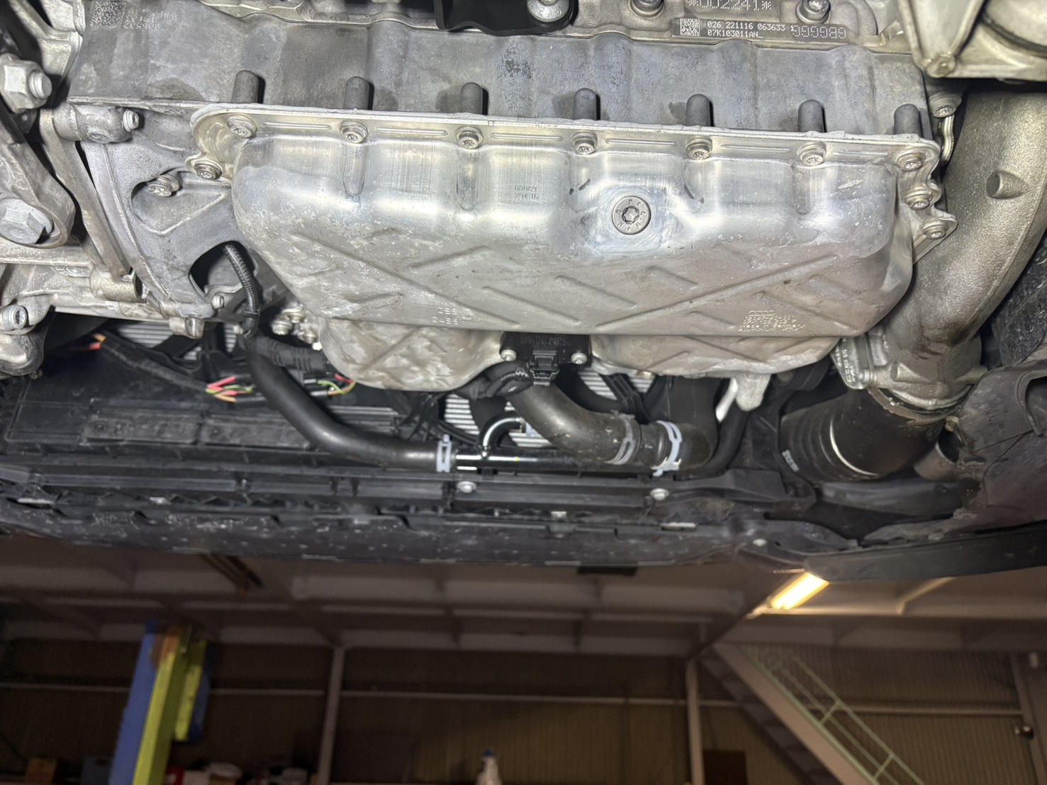 オイルパンを一度脱着し、接合面を丁寧に清掃したうえで液体パッキンを再塗布。組み付け後はエンジン始動および漏れチェックを実施し、オイル漏れが解消されていることを確認して作業完了となりました。