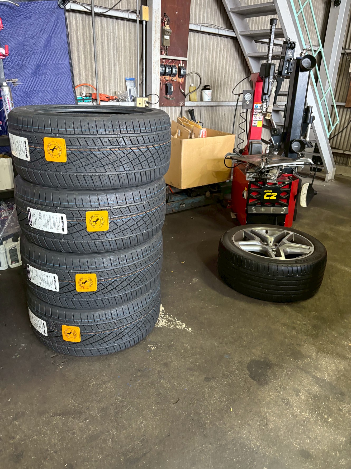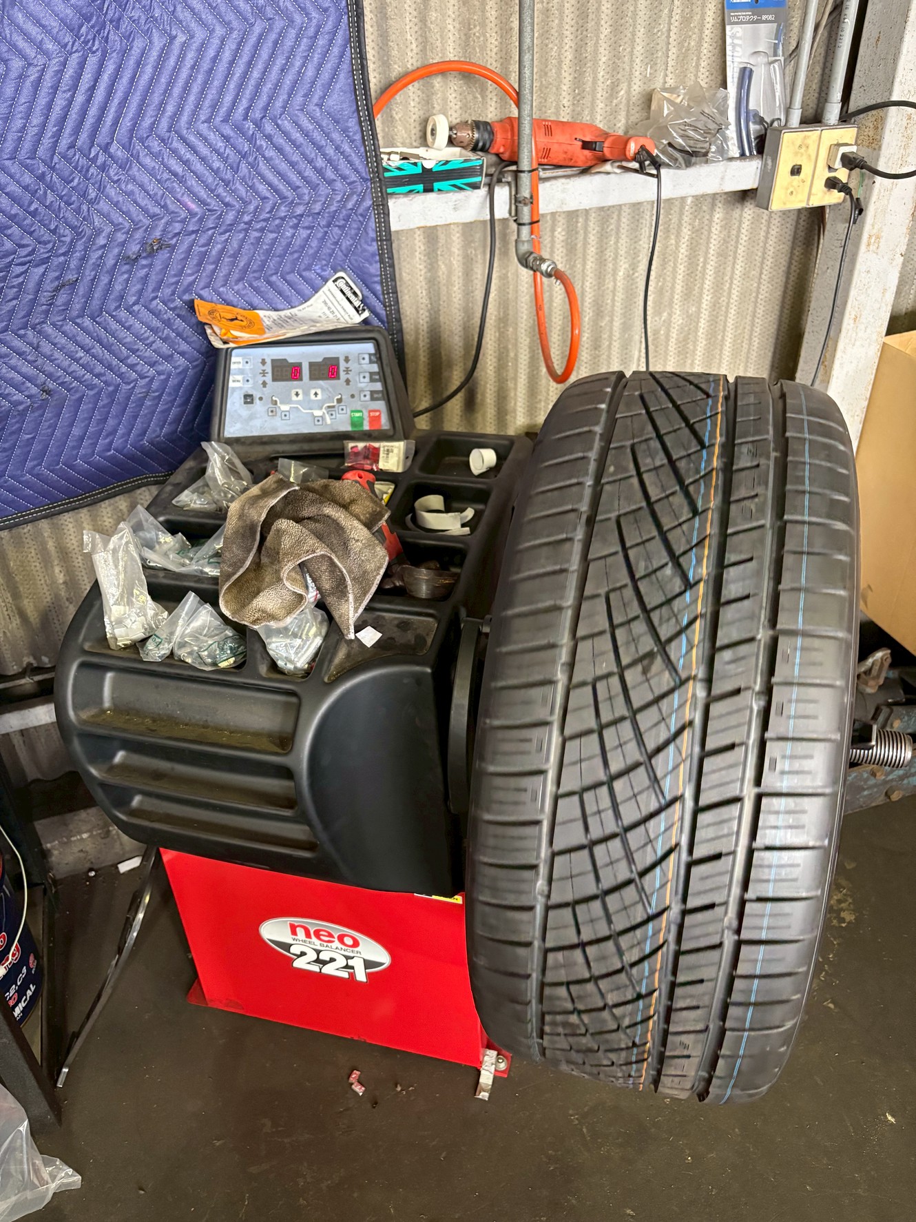 まず古いタイヤを慎重に取り外し、ホイールの状態や空気圧、ホイールバランスをチェック。持ち込みの新品タイヤをホイールに組み付け、専用機でバランス調整を行いました。偏摩耗や振れを抑えるため、均等に力をかけながら取り付け作業を進めました。