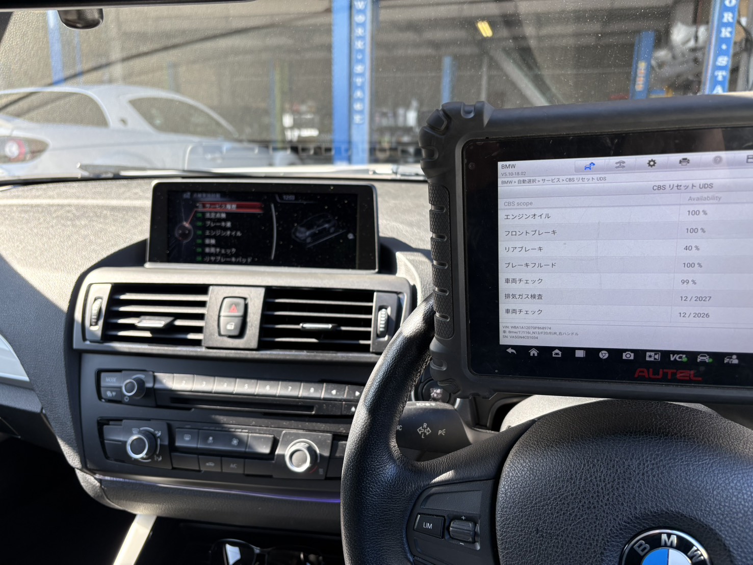 車検整備完了後、車両コンピューターにてメンテナンスインターバルのリセットおよび再設定を実施。警告表示を解除し、次回点検時期が正しく表示されるよう調整しました。